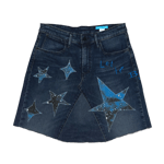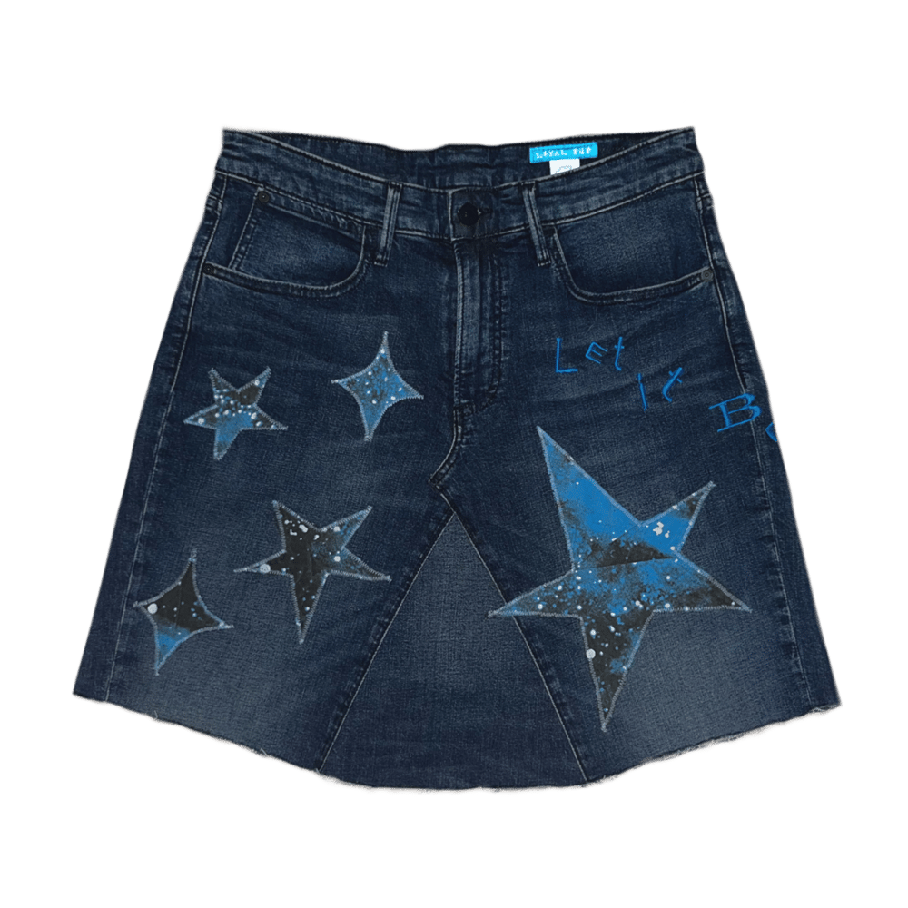reworked denim skirt with stenciled airbrush, appliqué, and embroidery text