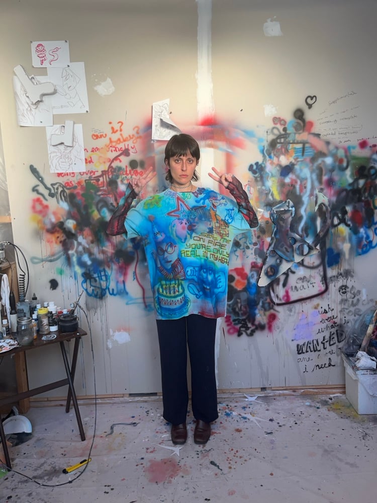 1 of 1, freehand airbrush on cotton tee with embroidered text